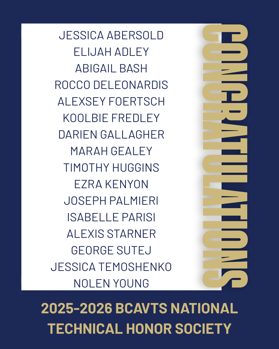 Congratulations to the following students on their admittance to the Butler County Area Vocational-Technical School (BCAVTS) National Technical Honor Society!